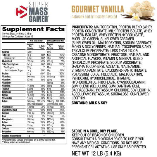 DYMATIZE SUPER MASS GAINER is a premium mass gainer with an appropriate calorific profile designed to meet the particular needs of bodybuilders, powerlifters and hard gainers in the bulking phase. Especially during phases of intense training, it is essential to ensure an appropriate and target orientated nutrient intake. A target orientated nutrient intake helps to support muscle growth, improve training performance and reduce fatigue. Our “POWERHOUSE Formula” is a special matrix developed to deliver a powerful combination of creatine, carbohydrates and proteins, satisfying your specific demands during the bulking phase.